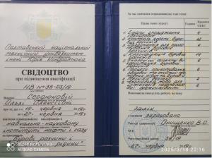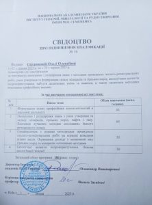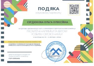 1. Подяка науковому керівнику Сердюковій О. О. за підготовку здобувача Корецького Б. (студент 3-го курсу) до участі у ІІ Міжнародній студентській науковій конференції Пріоритетні напрямки та вектори розвитку світової науки, 19.112021р, м. Дрогобич. (Особливості формування покладів вуглеводнів Юліївського нафтогазоконденсатного родовища).